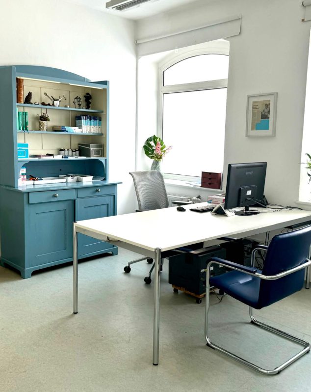 Helle Arztpraxis mit weißen Wänden, blauer Möbelkombination und Pflanzen am Fenster.